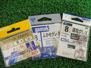 仕掛け作りをするときのおススメ針 真鯛王:7号、PE真鯛:6号、グレ針:8号 等などが良いかなと! 真鯛の大きさ2〜3kg物が増えてきたら |